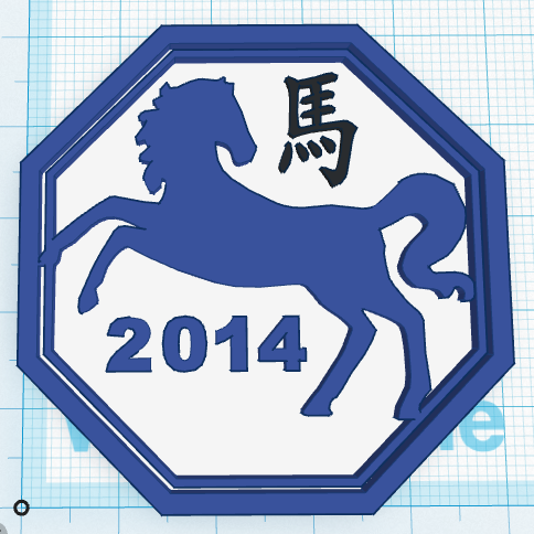 Even better, the file was an .svg filetype which is a 2D vector image format that can be imported directly into 3D design program Tinkercad. I created a new design in Tinkercad and then clicked Import–>URL and copied and pasted the image URL into the box. (http://upload.wikimedia.org/wikipedia/commons/7/76/Horse.svg) I selected Scale 10% and Height 2mm. I then found an .svg file of the Chinese character for horse and imported that into the design using the same steps. I added the numbers 2014 from the built-in Tinkercad characters. I moved and resized the components making sure the height ended up at 2mm to complete the design.