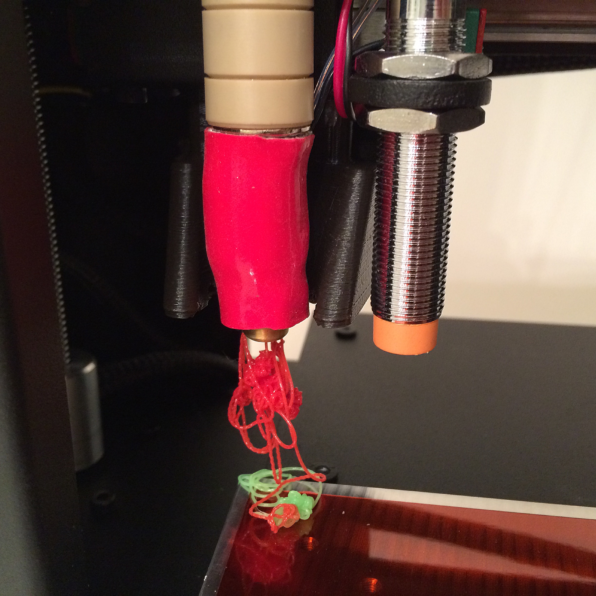 Calibration: Brought extruder up to temp and loaded new filament. A little bit of neon green fin extruder from the factory test. Ran an existing model to start the process of leveling the z-probe. The printer leaves the factory with the extruder set a little high in respect to the z-probe activation height in case something settles in shipping. Driving the extruder into the metal print bed with no springs on the bed and a fully constrained z-axis would be very bad for the the bed surface and the print nozzle.