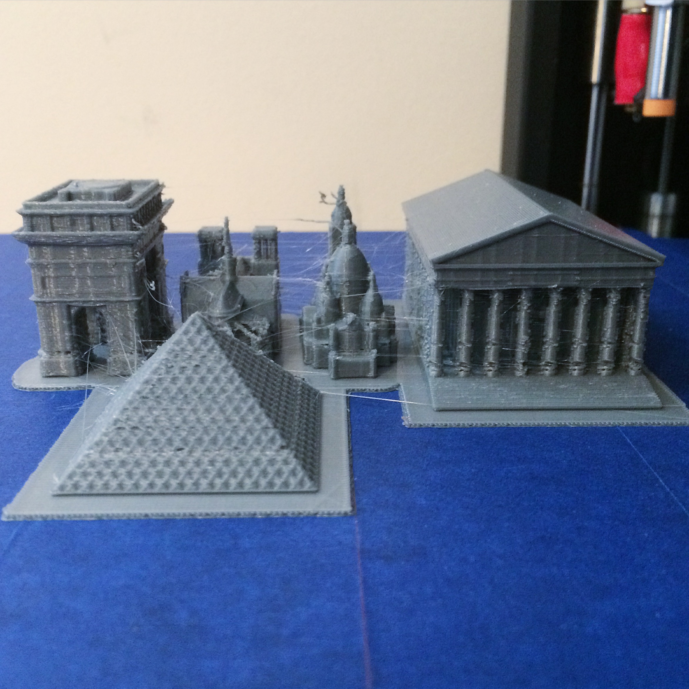 Torture Print: Running the printer for 11 hours using a set of Paris buildings from LeFabShop. French teacher asked for these models for use in class. Type of project where I would like to be able to run a bunch of small things overnight and have good quality. Print finished without jamming. Some underextrusion mid-print. Overall all models are level. Issues with spider webbing using cheap MicroCenter filament. Will have to adjust settings and try different filament.