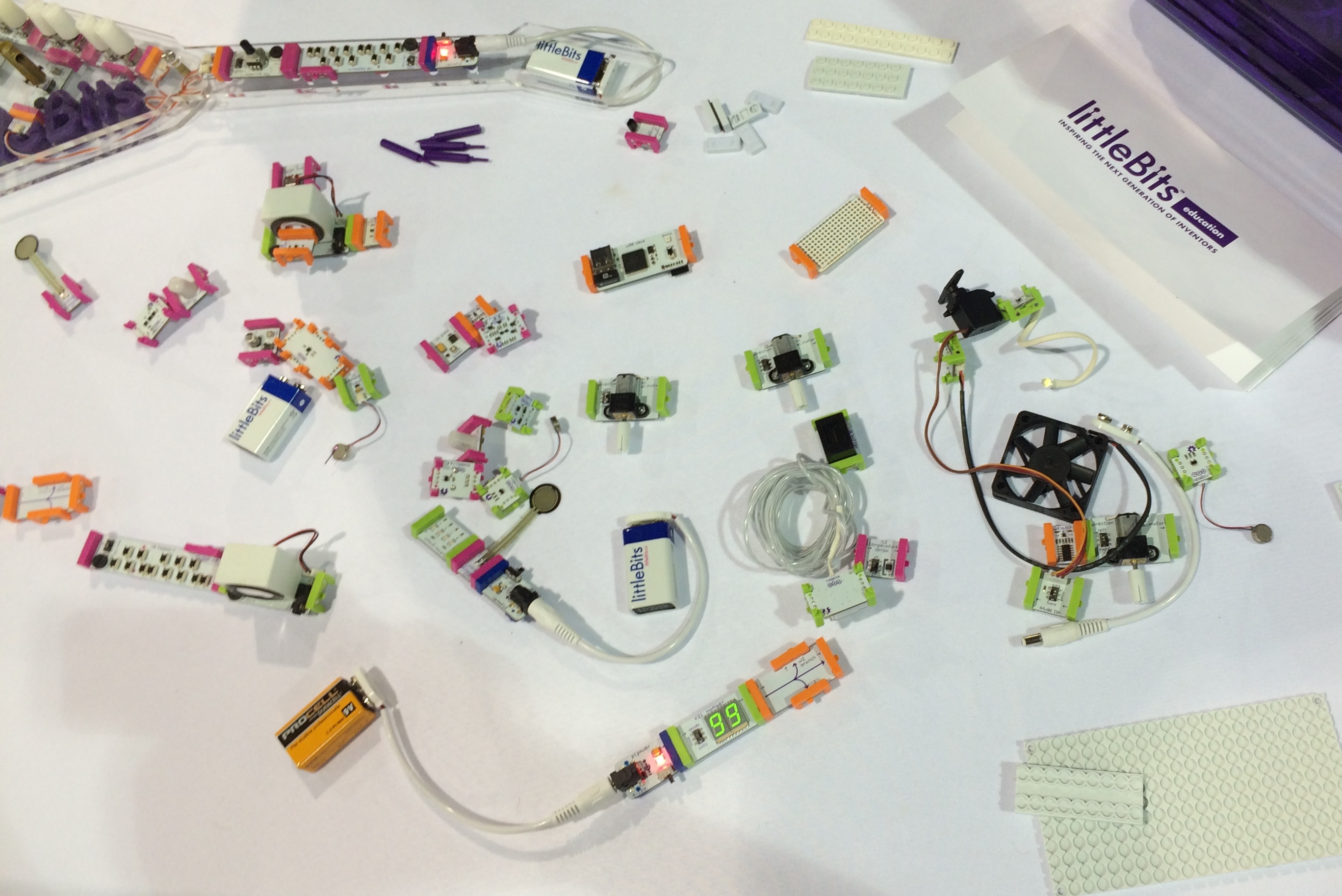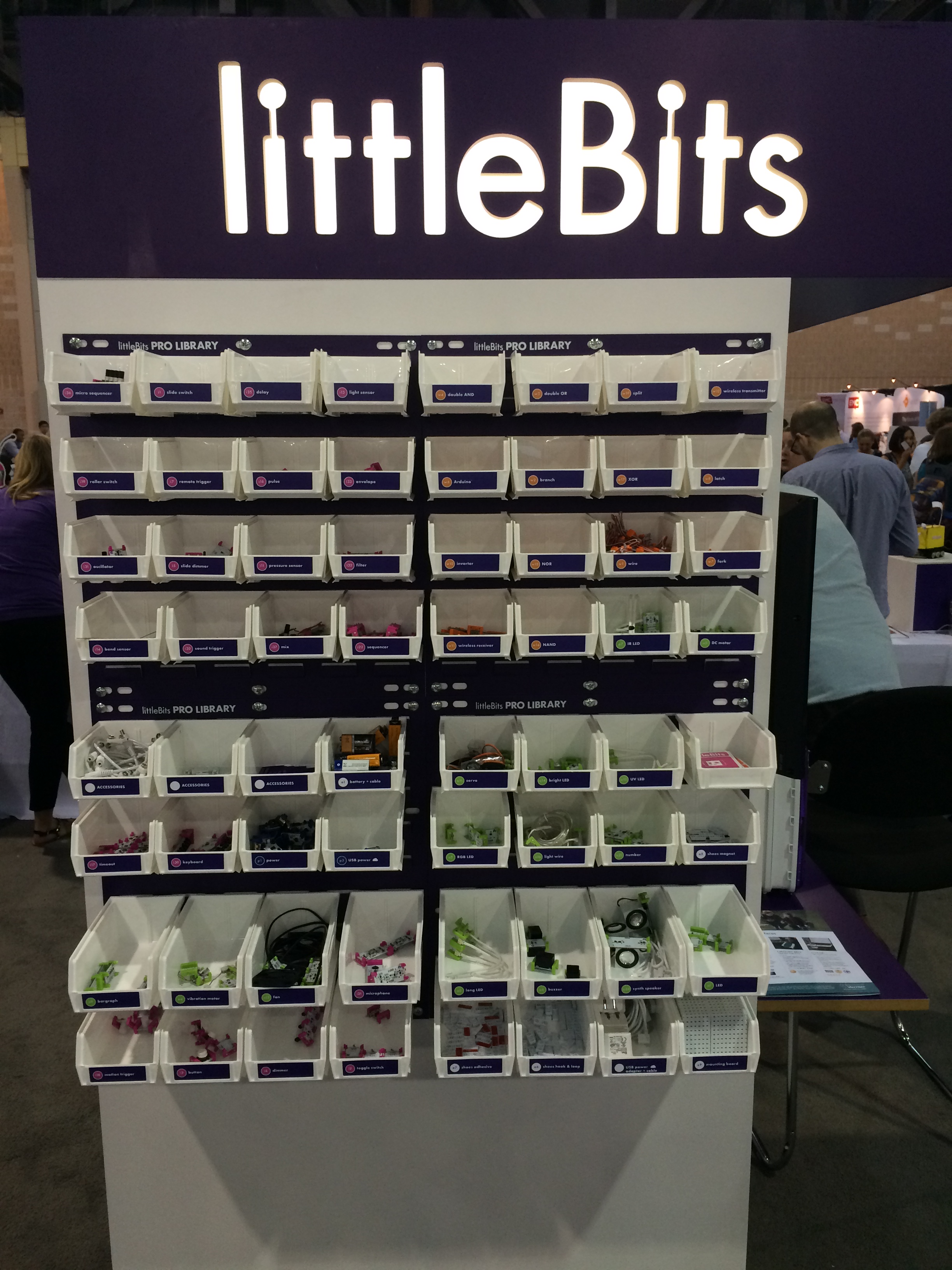 Late in the day on Monday, I was walking the hall with a MakerEd friend. (I’ll call him Darth to protect his identity.) So, Darth and I were visiting a few specific booths and keeping an eye out for anything new. We were also on a light swag hunt (seeing what vendors were giving away). It was very casual and there was hardly anyone in the hall. As we were getting ready to go, Darth scanned the banners and said, “Hey! There is littleBits. Let’s go see what they got.” If you haven’t been to the vendor hall it is an aircraft hangar sized room filled to the brim with booths and banners from technology names big and small. There are huge displays from giant companies like Google, Microsoft and Pearson. (Map) But for maker educators like Darth and I, littleBits was a booth worth visiting.