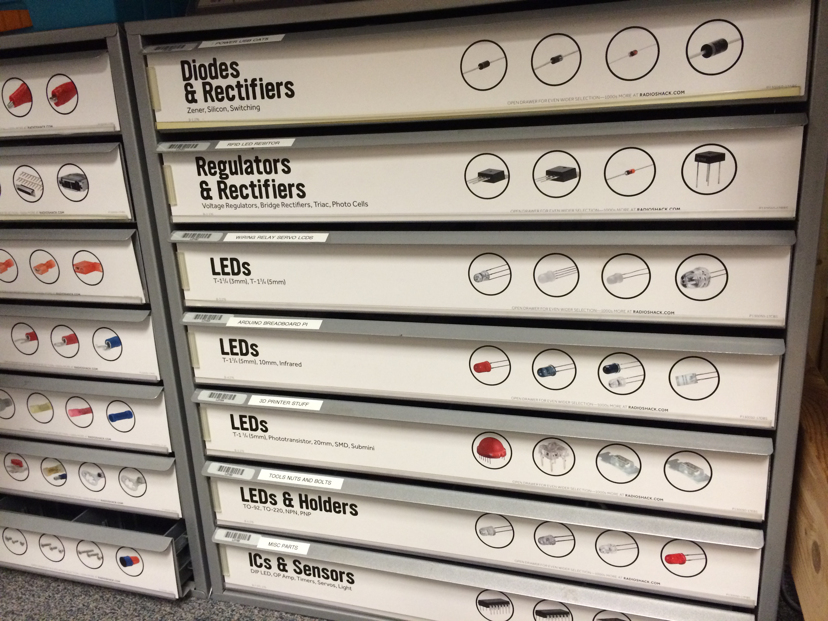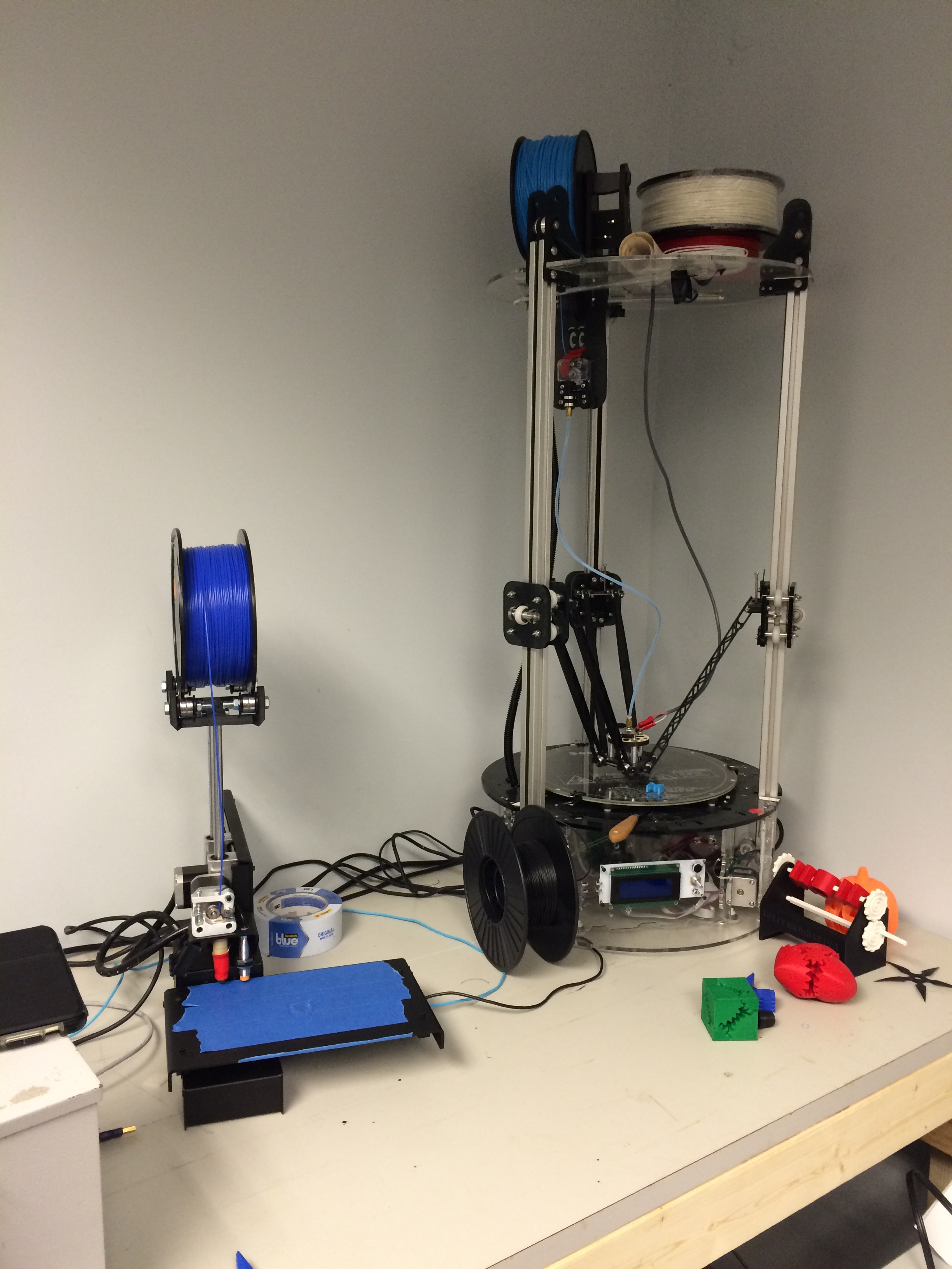 The first workroom off the main central space contains a few 3D printers including a Printrbot Metal Simple, a circuit board mill, and an electronics workstation. An electronics part bin salvaged from a closing Radio Shack provides storage underneath the desk. Several members are working on 3D printer builds and there was some talk about a future 3D printer build group.
