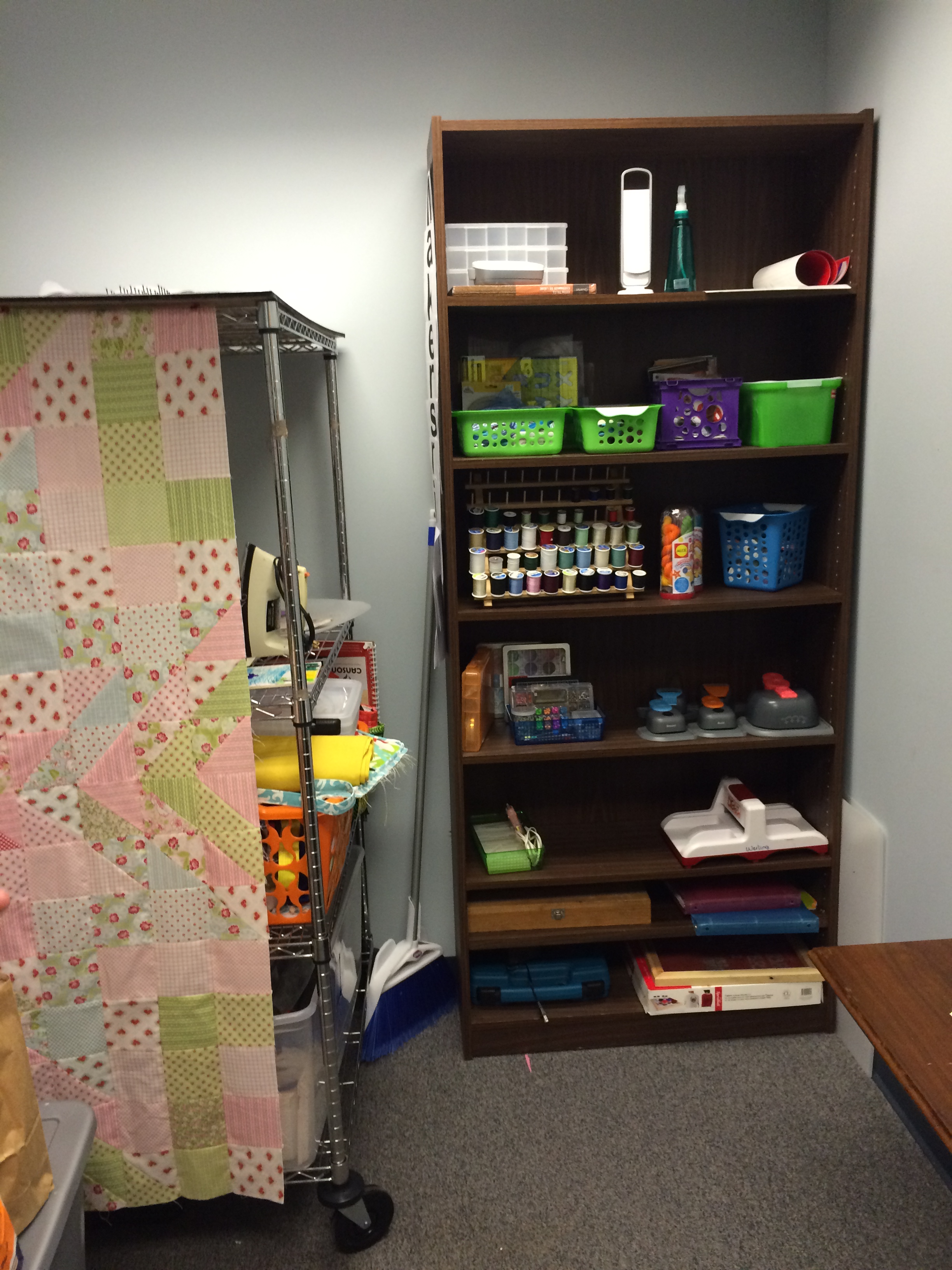 The next room contains textiles and paper cutting tools with the makings of some cosplay costumes. A steam punk costume was completed recently. There were also several sewing machines. A display cabinet outside the room showcases member projects.