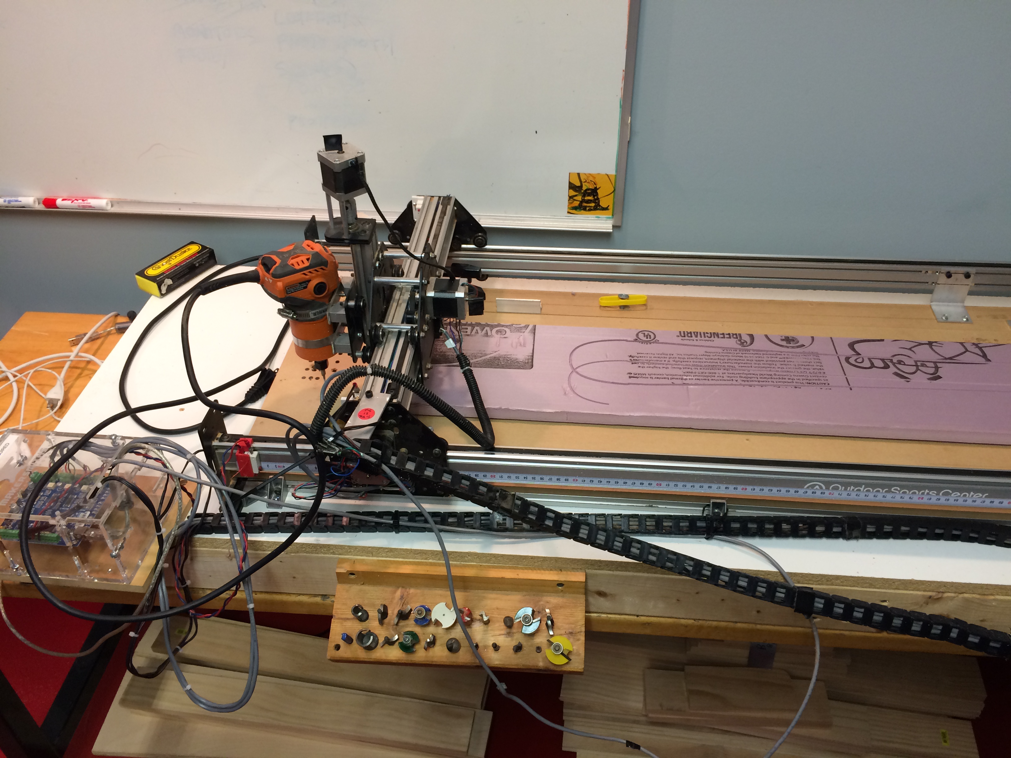 The next room contains hand tools, smaller power tools and a large scale CNC machine currently setup to cut skis.
