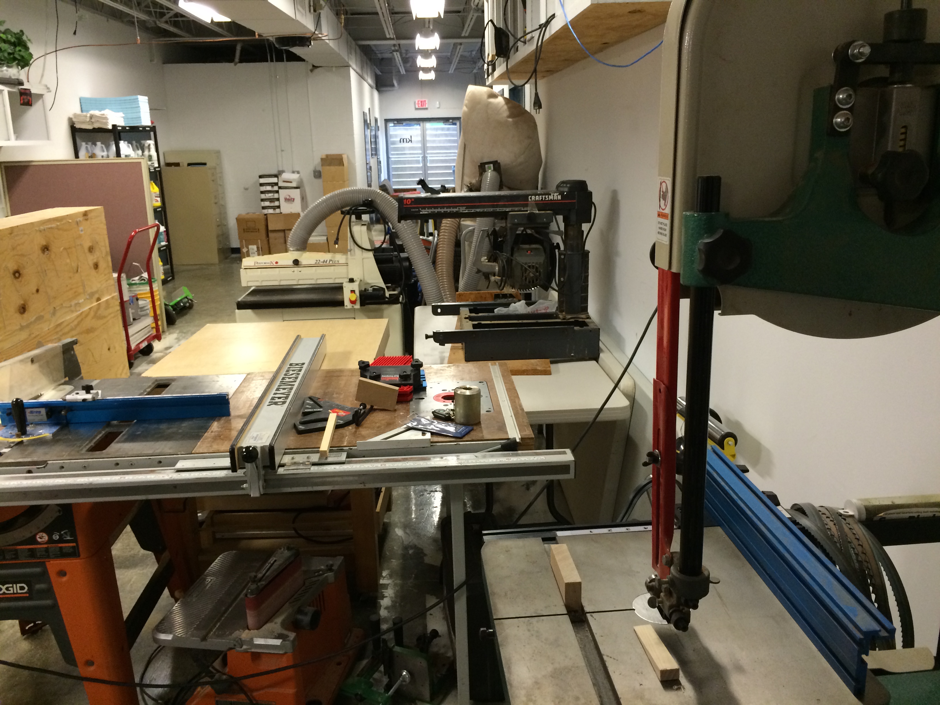 The back room contains large woodworking tools and a dust collection system. The woodworking space is a little tight at the moment but all the equipment is there. The back area also includes a kitchen and bathrooms.