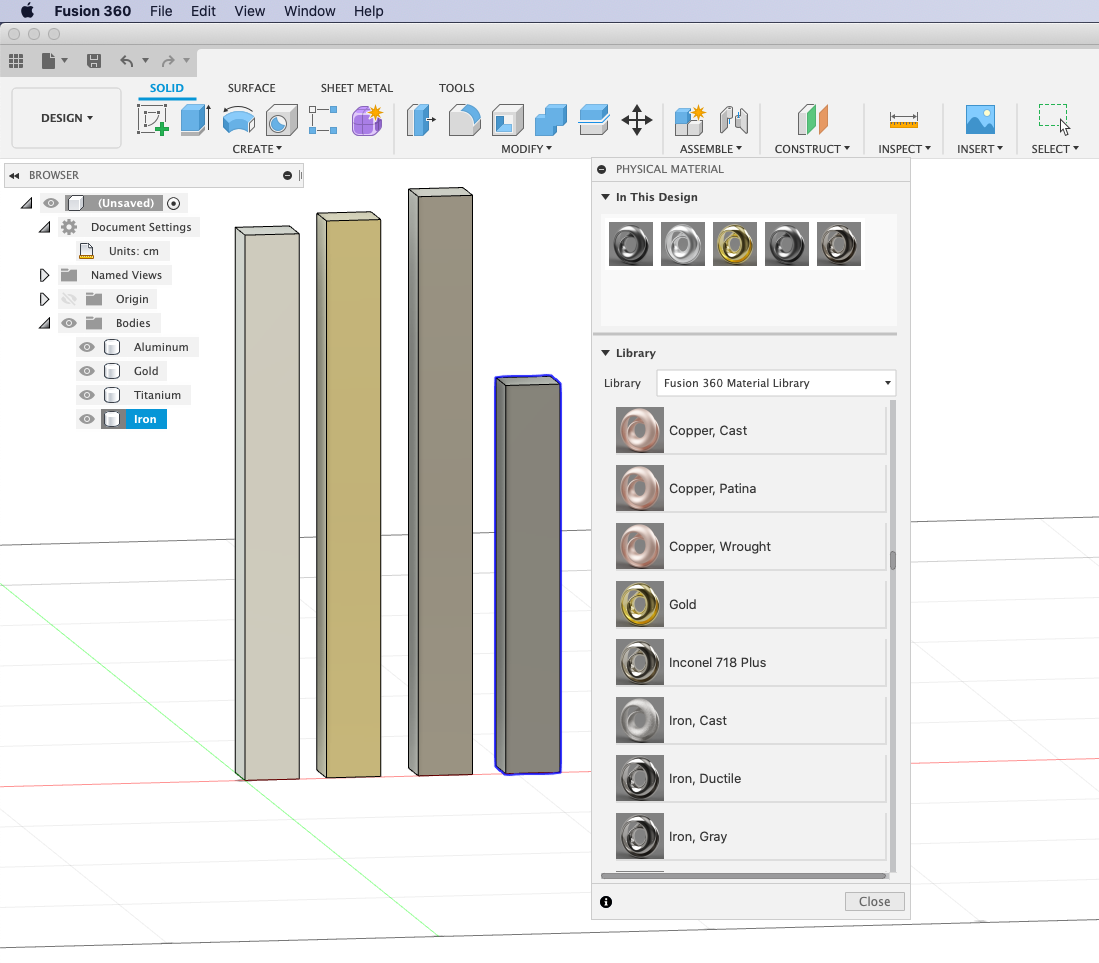 Of course distance learning makes this activity impossible but CAD tools like Fusion 360 give a virtual option for exploring mole concepts in human scale dimensions. When creating bodies in Fusion 360, students can select a physical material, including a range of metals.